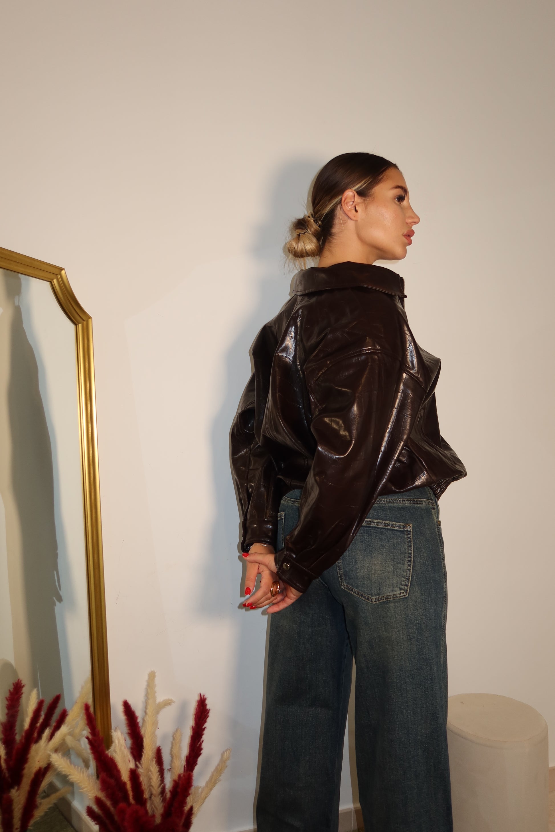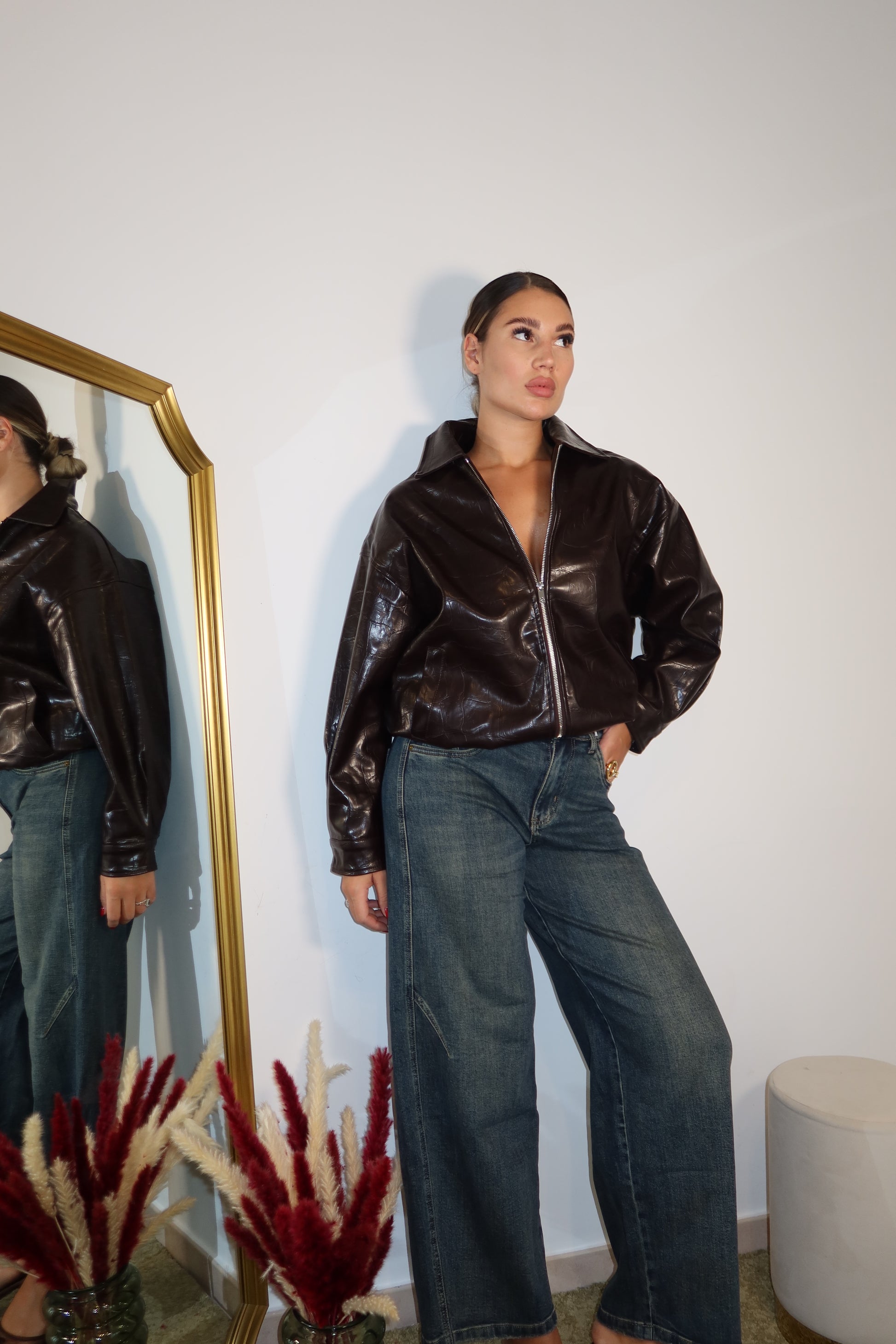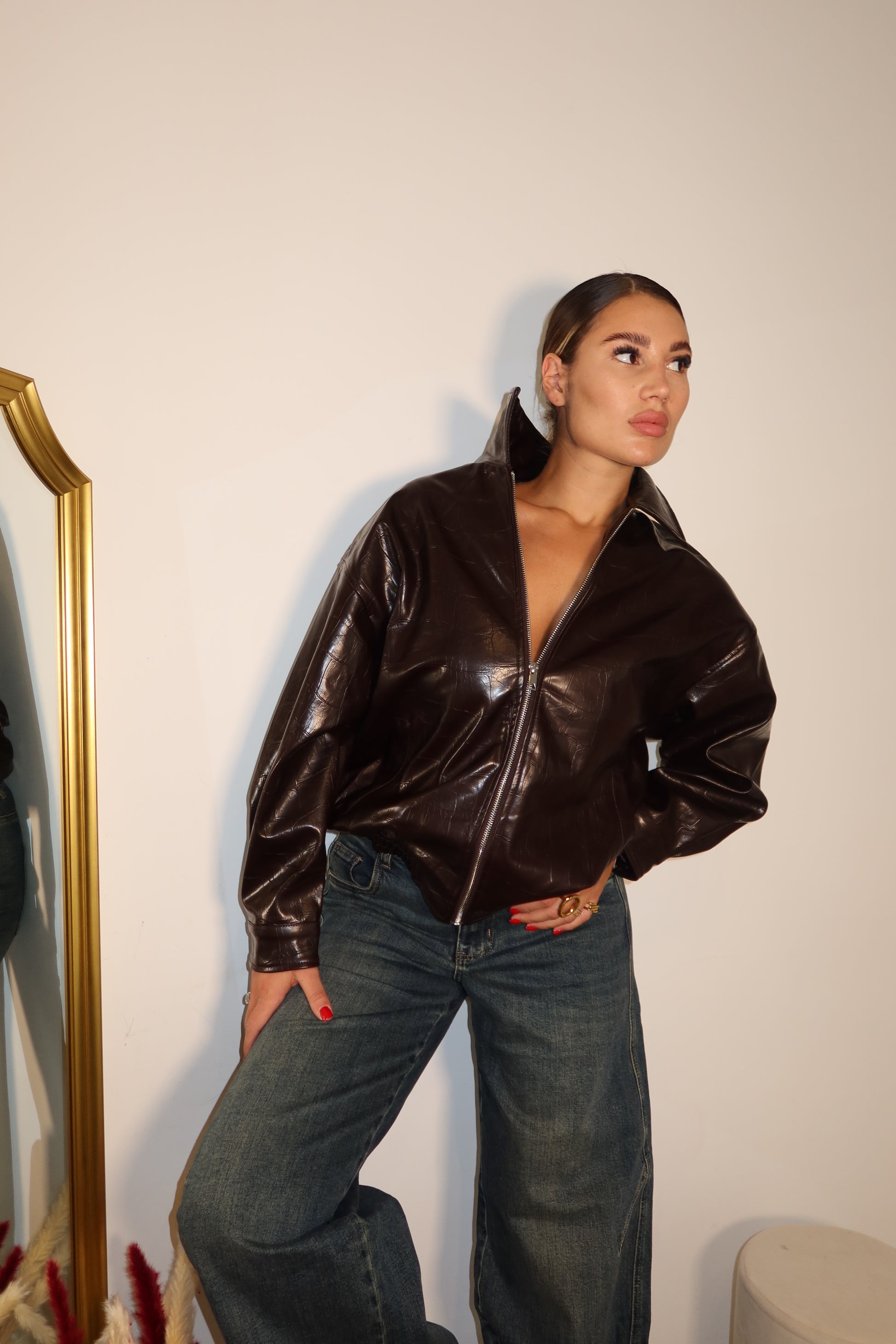 Giubbotto in ecopelle color cioccolato, dalla vestibilità morbida e dal taglio contemporaneo. Collo alto strutturato, zip frontale e finish lucido per un look sofisticato e deciso. Un capo versatile che eleva ogni outfit, dal denim casual ai pantaloni più eleganti.
