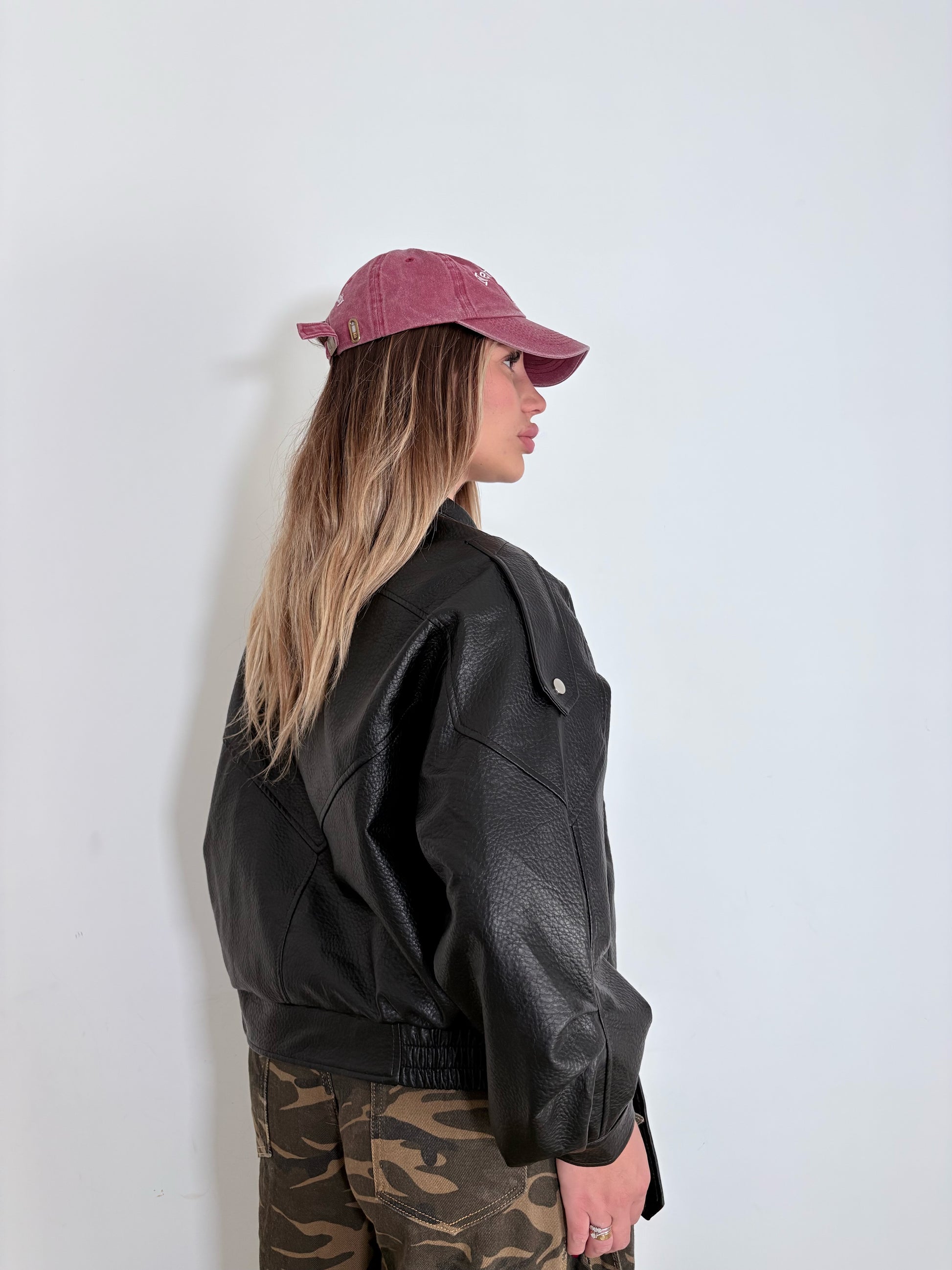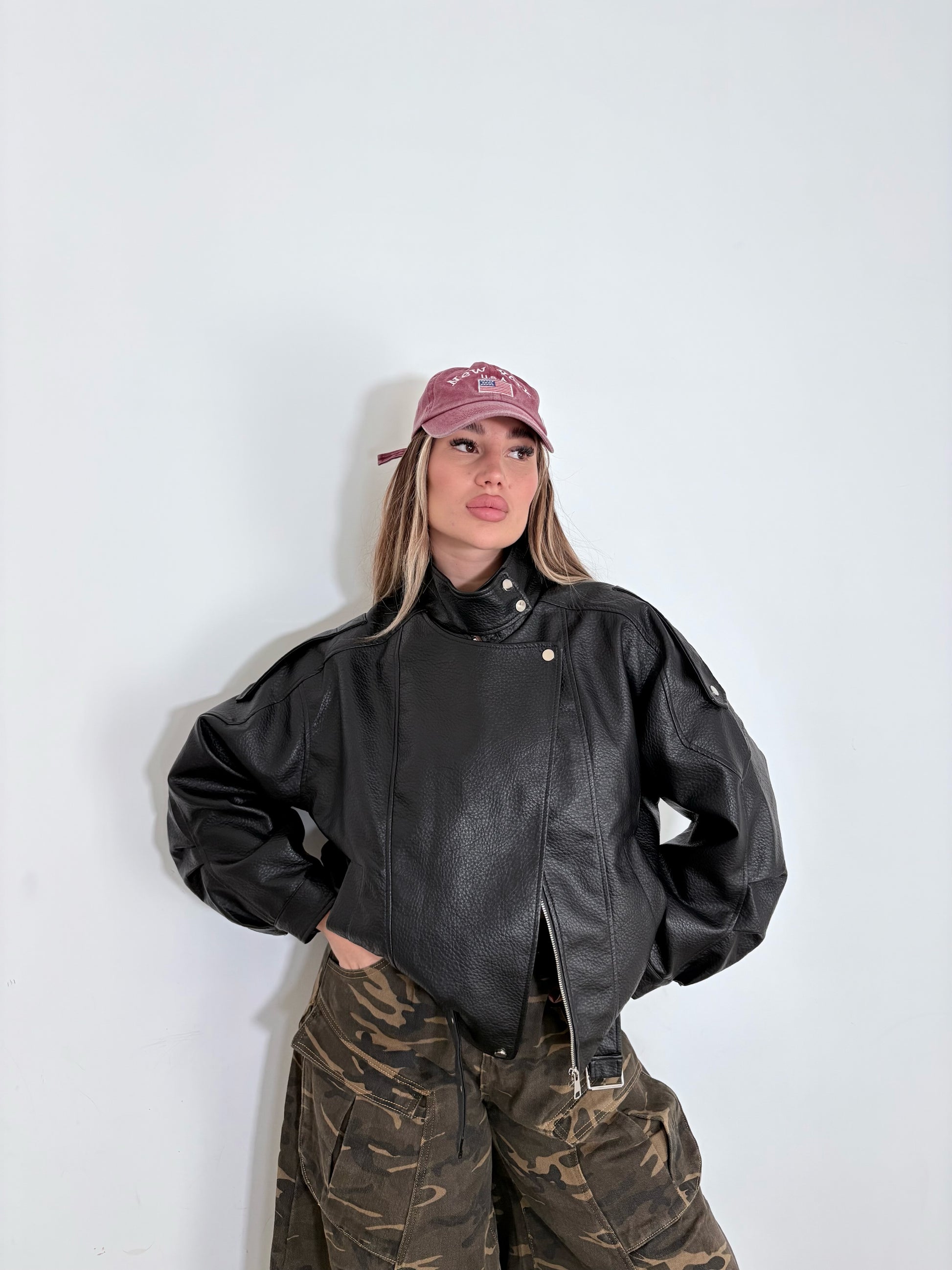 giubbotto in pelle con imbottitura all’interno; molla e cinta , è taglia unica veste dalla xs-xl .